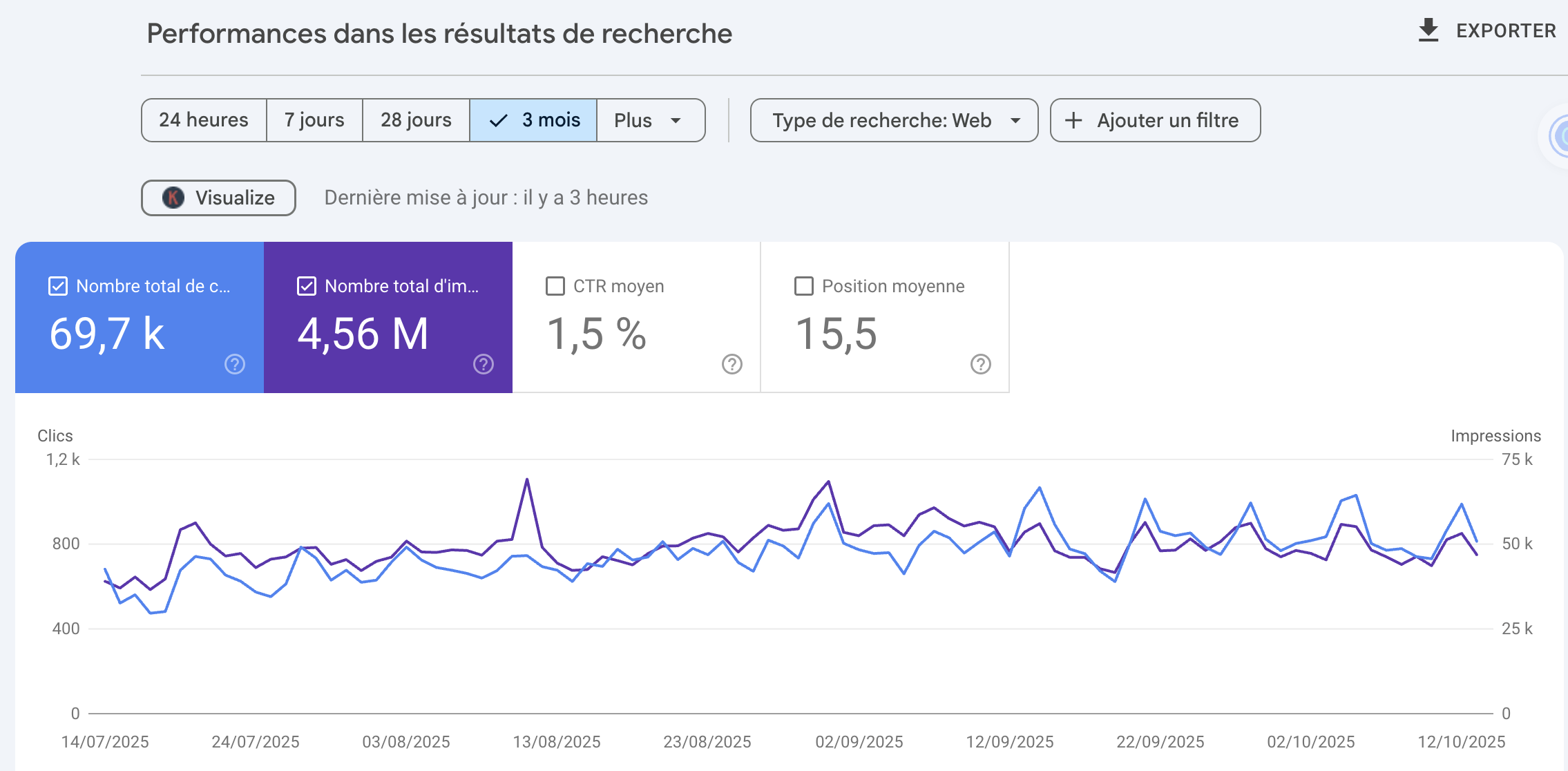 - Le CTR (taux de clics) moyen que vous obtenez sur résultats de recherche. S'il n'est pas bon, cela signifie peut-être qu'il est bon de procéder à une optimisation de vos Meta Titres et Meta Descriptions pour inciter davantage à l'action et au clic