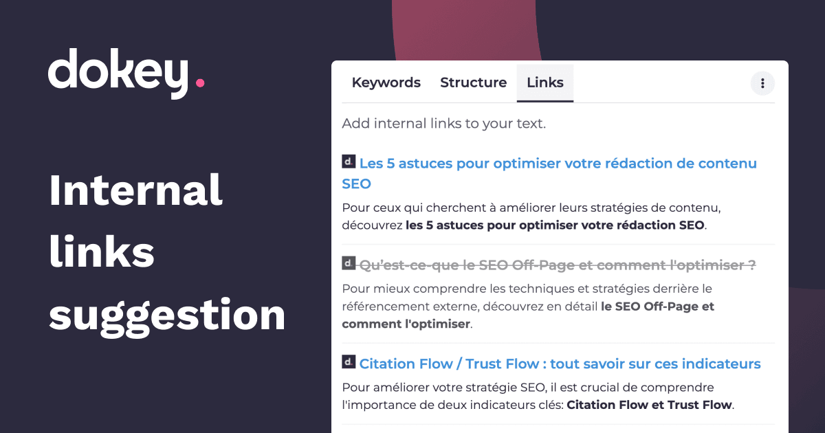 Thanks to our internal link suggestion algorithm, you can quickly choose which pages to link within your text.